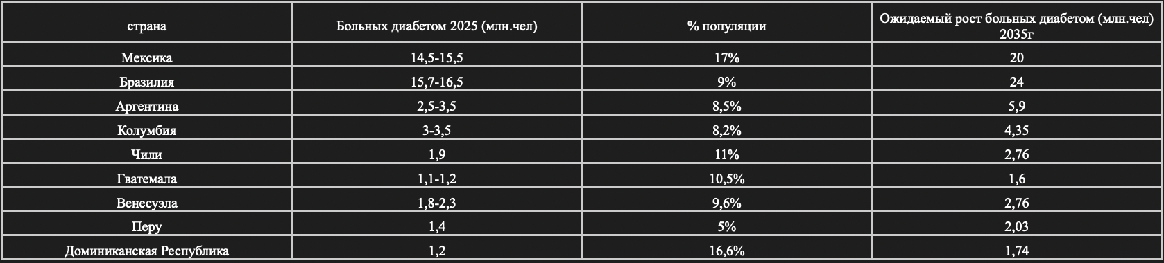 В обеих странах диабет требует постоянного наблюдения, и пациенты используют тест-полоски ежедневно. Страны Латинской Америки, население которых страдает диабетом и болезнь показывает устойчивый рост: